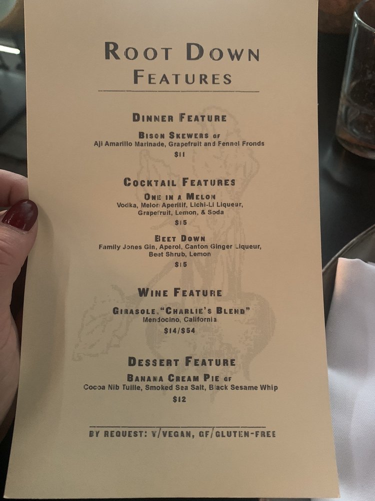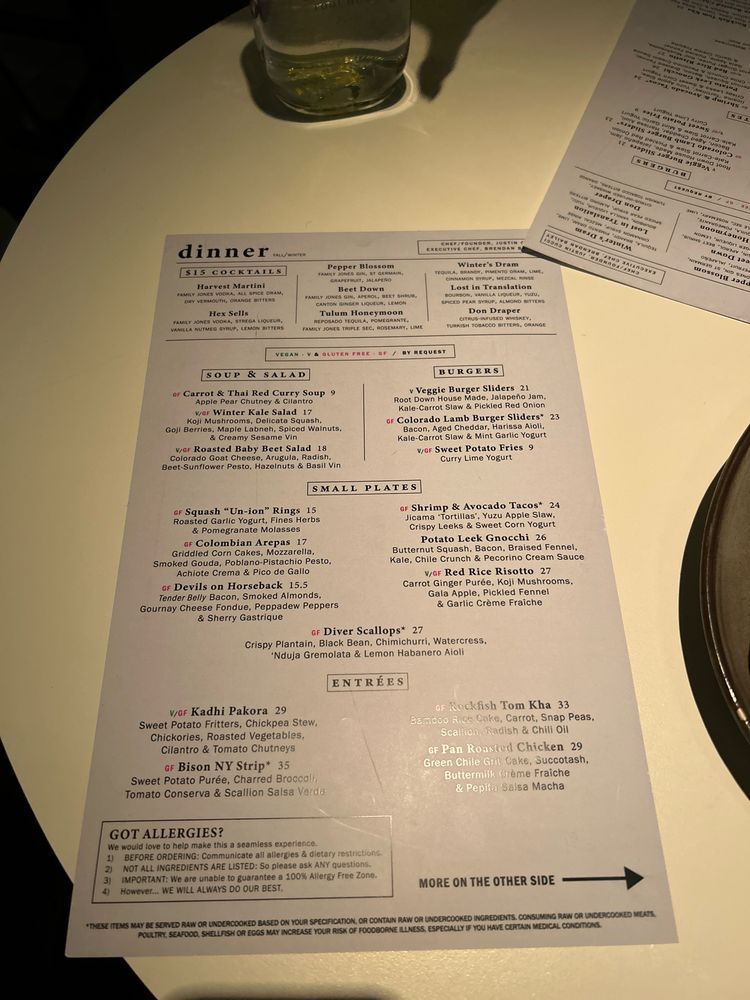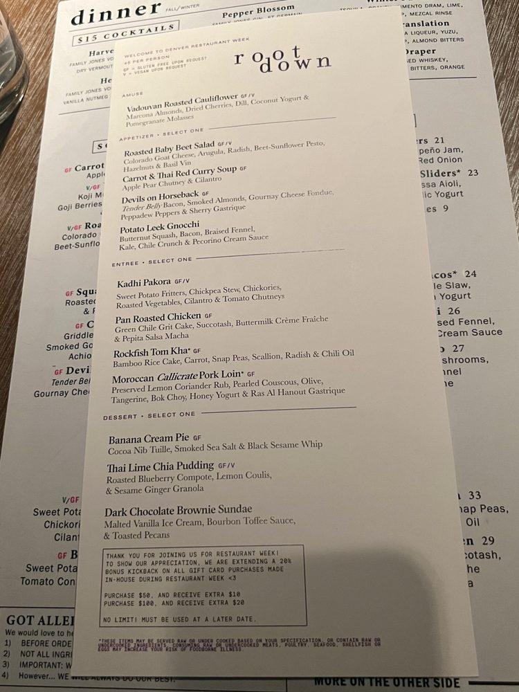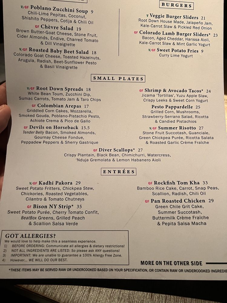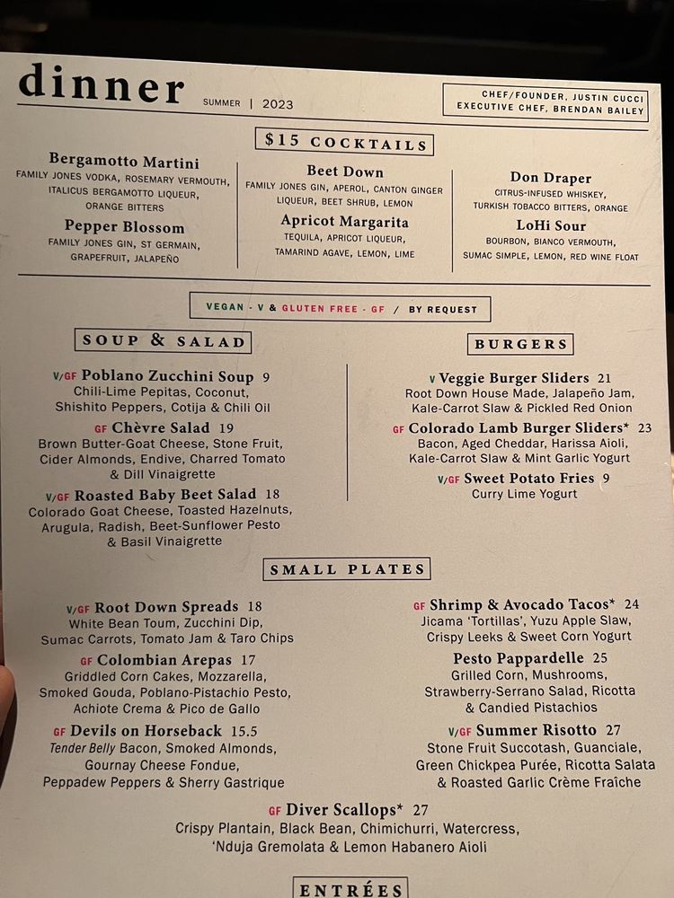 Root Down offers a trendy and diverse menu featuring vegetarian, vegan, and pescatarian options. Located in Denver, CO, this restaurant provides a wide range of amenities including outdoor seating, happy hour specials, and a full bar. Customers rave about the accommodating staff, custom orders, and flavorful dishes like the chicken and goat cheese biscuit, rockfish, and Vadouvan roasted cauliflower. With a warm and inviting atmosphere, Root Down is perfect for brunch, dinner, or group gatherings. The menu includes seasonal entrees and creative cocktails, catering to various dietary needs. Overall, Root Down exemplifies excellent customer service, intentional ingredients, and a great dining ambiance, making it a must-visit spot for food enthusiasts looking for a unique and satisfying experience.